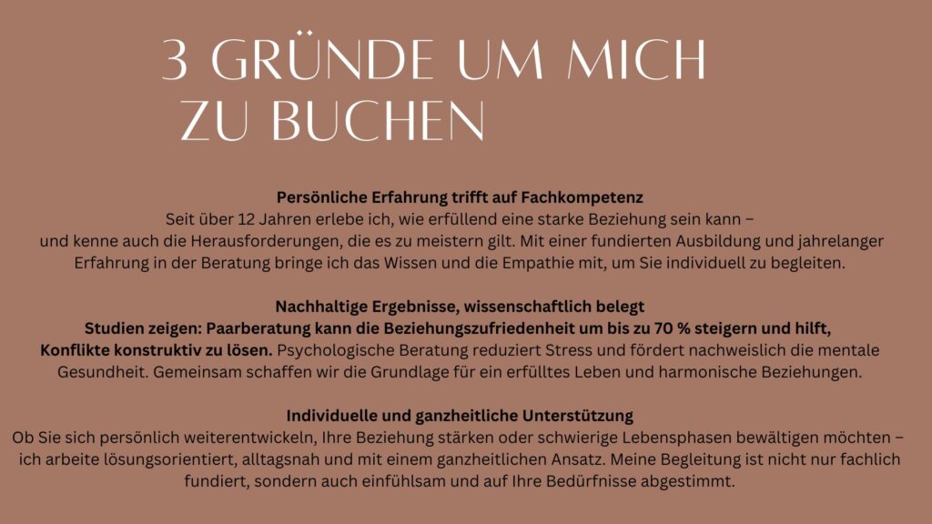 Mit Herz, Empathie und fachlicher Expertise begleite ich Sie dabei, die Antworten und Lösungen zu finden, die wirklich zu Ihnen passen. Jede Situation ist einzigartig – genauso wie meine Unterstützung für Sie.